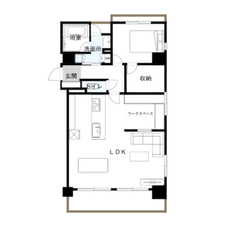 ①ベッドスペースを作り、広々としたワンルームを実現。