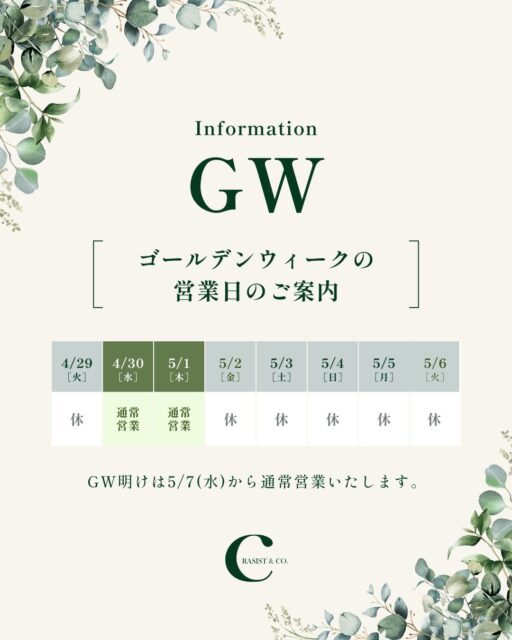※ゴールデンウィーク明けは、5月7日(水)より通常営業いたします。